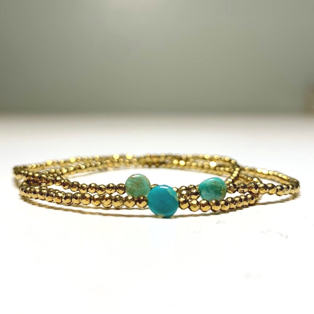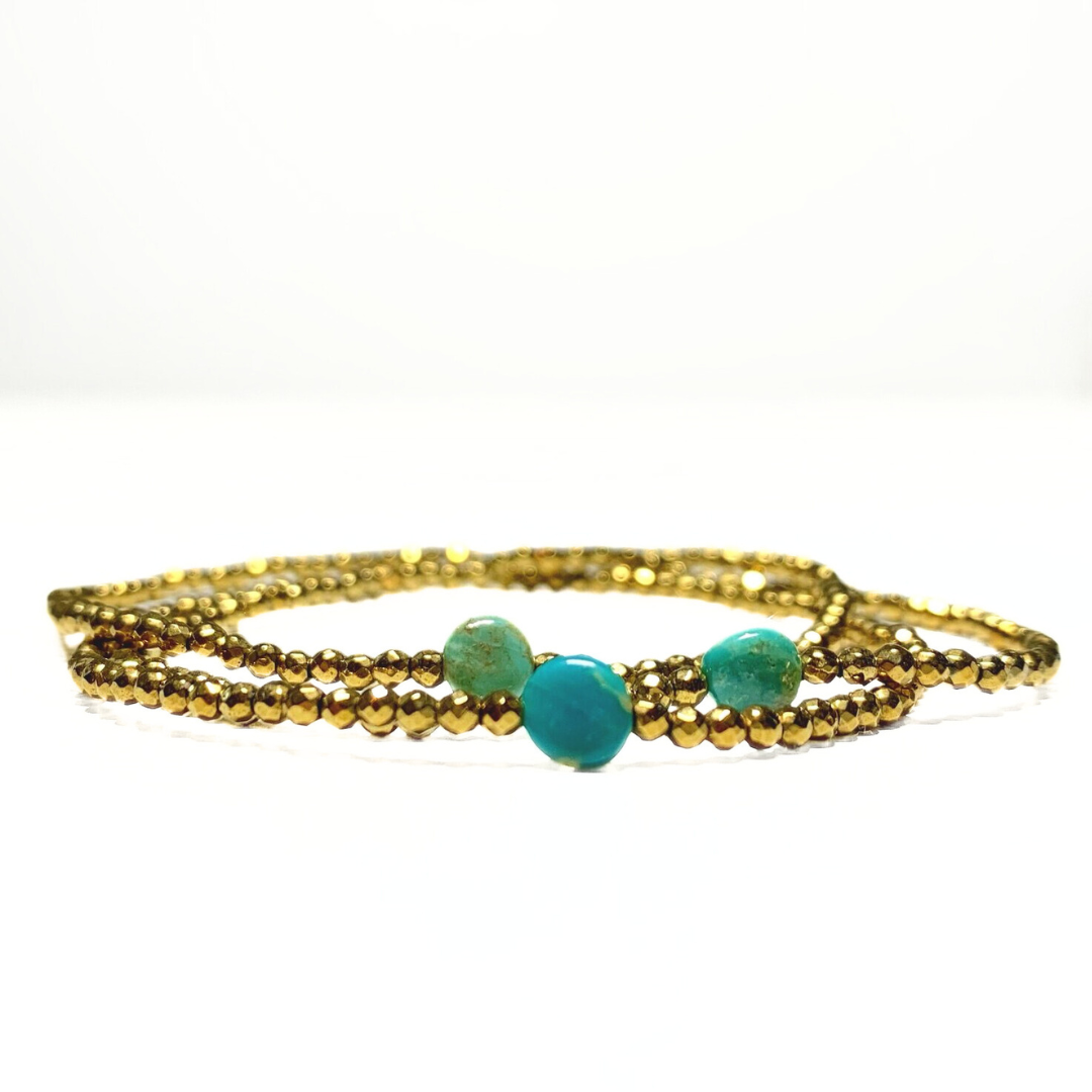 Gorgeous and tranquil Tibetan Turquoise nestled in a sea of Golden Hematite to keep one tranquil, grounded and in truth. pairs well with other jewelry or stack a few together as seen here. the perfect summer splash of color for the beach or a trip out on the town.
