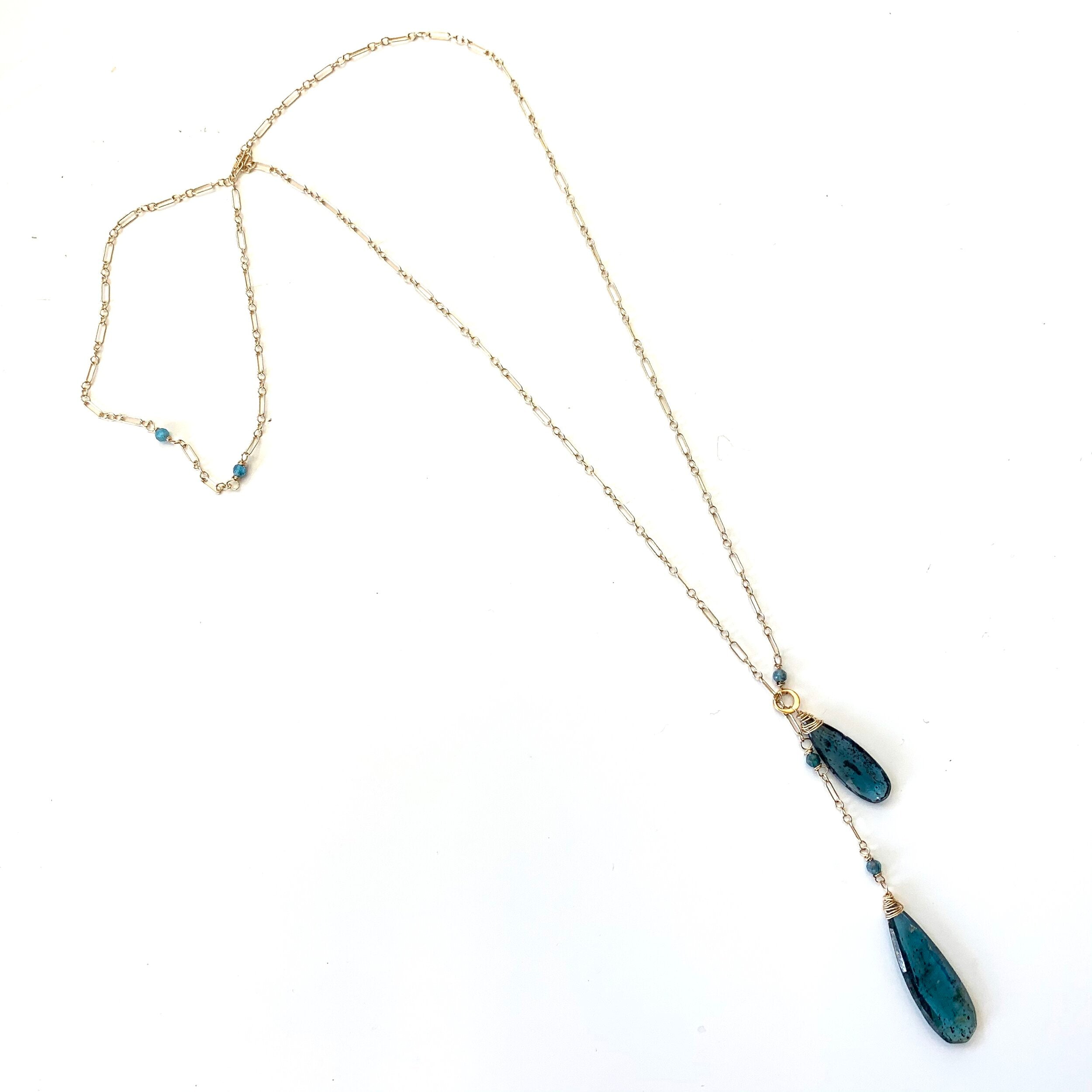 This exquisite lariat of Teal Kyanite, the color of the crystal clear Aegean Sea adorn a unique and delicate chain dotted with bits of sea hued Apatite. Both the healing of the gemstones and the color can be felt the moment one puts this beauty on. This versatile necklace can be worn several different ways and is 28" long.