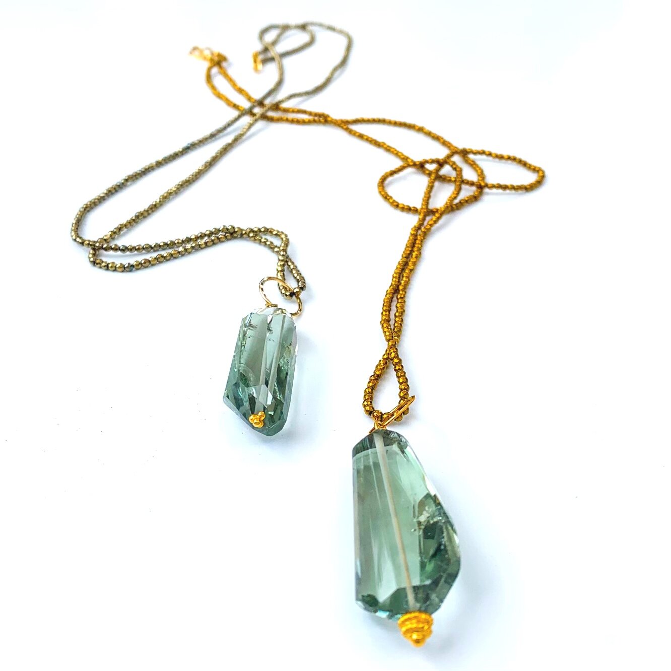 This gorgeous gem Green Amethyst, also known as Prasiolite, feels like magic. It is known to open the heart to receive and share love, encourage us to share our divine gifts with the world, connect with nature and create abundance. Adorning a strand of golden Hematite, this sacred piece if jewelry can be layered, worn long and wrapped short to place gemstone between the heart and throat chakras. 30” strand.