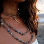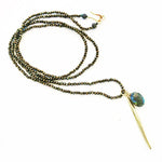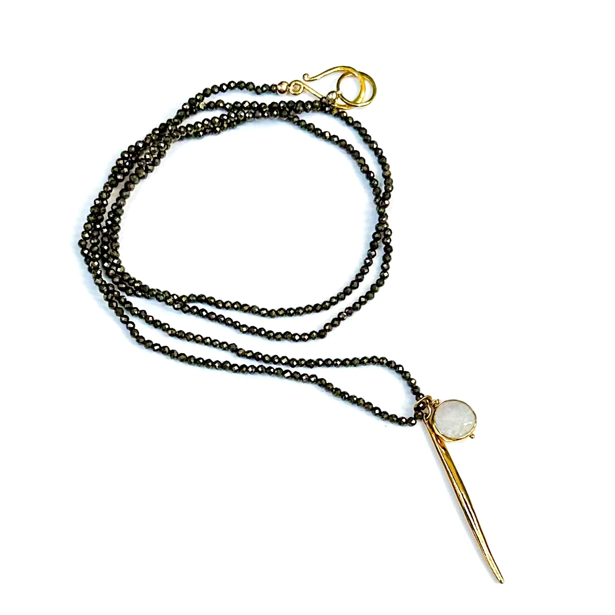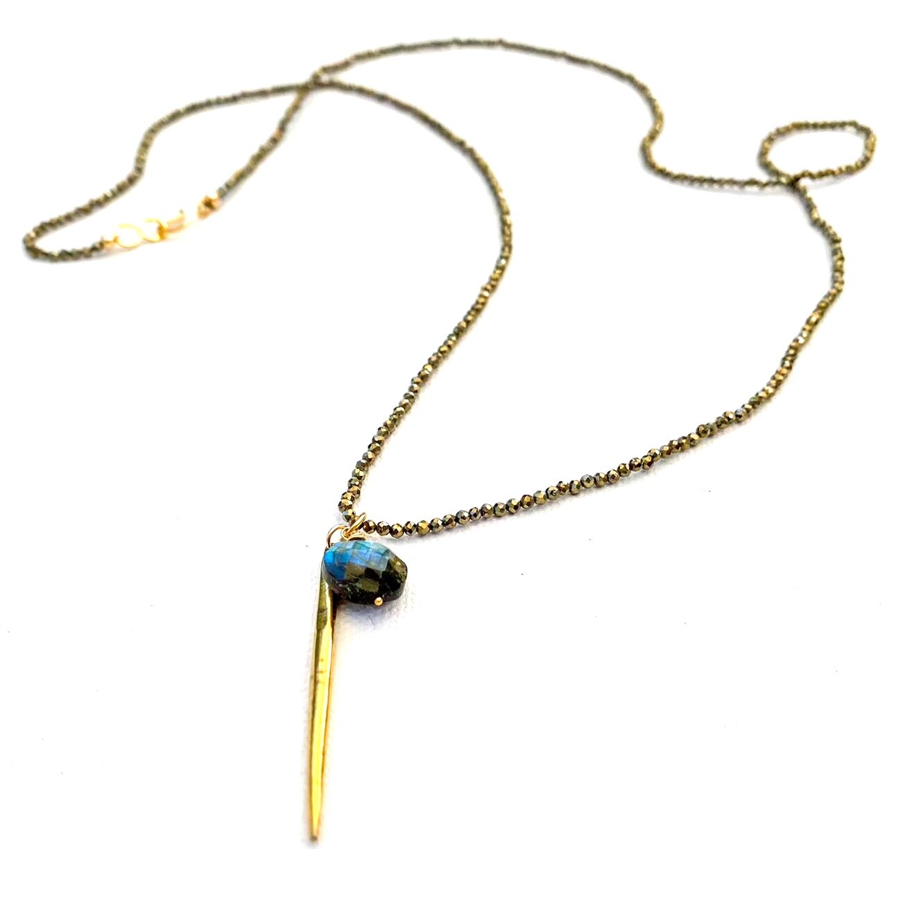 A silk strand strung with Golden Pyrite - a highly feminine, protective and grounding stone which enhances memory and focus, paired with Labradorite - the Stone of Magic and Bringer of Light, also very protective with an 18k vermeil golden spike for added protection. Versatile and easy to wear, this piece can be wrapped short to be worn at the heart chakra or worn long solar plexus.