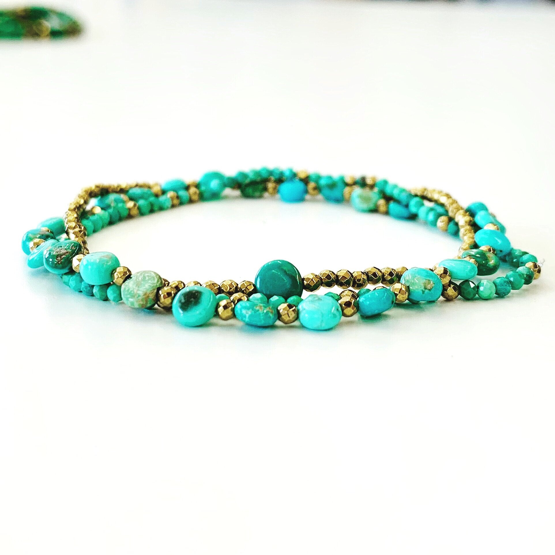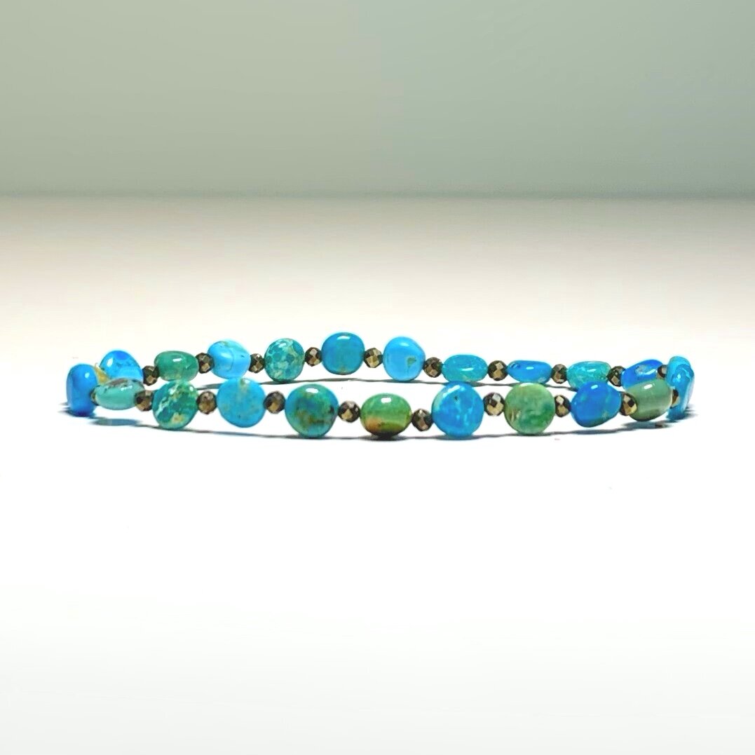 A gorgeous combination of Tibetan Turquoise, Natural Pyrite and Labradorite float together like the Sea and the Stars. The perfect Accessory for day or night …. at the beach or for a night out stacks well with Tranquil Truth, Truth Bracelets and your favorite jewelry.