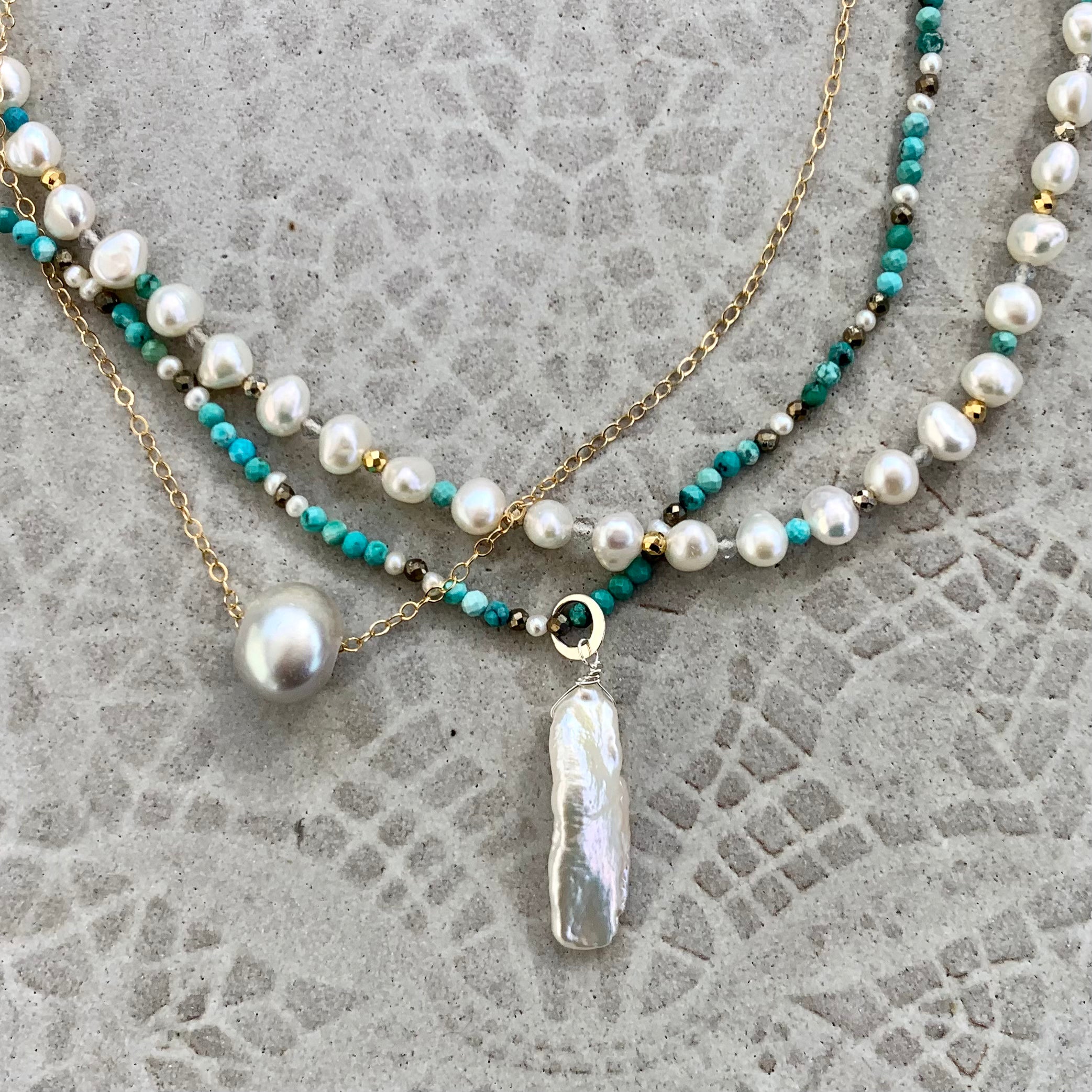 Creamy Freshwater Pearls strung with a touch of sparkle of pyrite, golden hematite and labradorite with the earthiness of green turquoise makes for an updated , breezy and modern take on a classic and timeless beauty. This strand of pearls that mixes in with most other gold and silver pieces of jewelry.