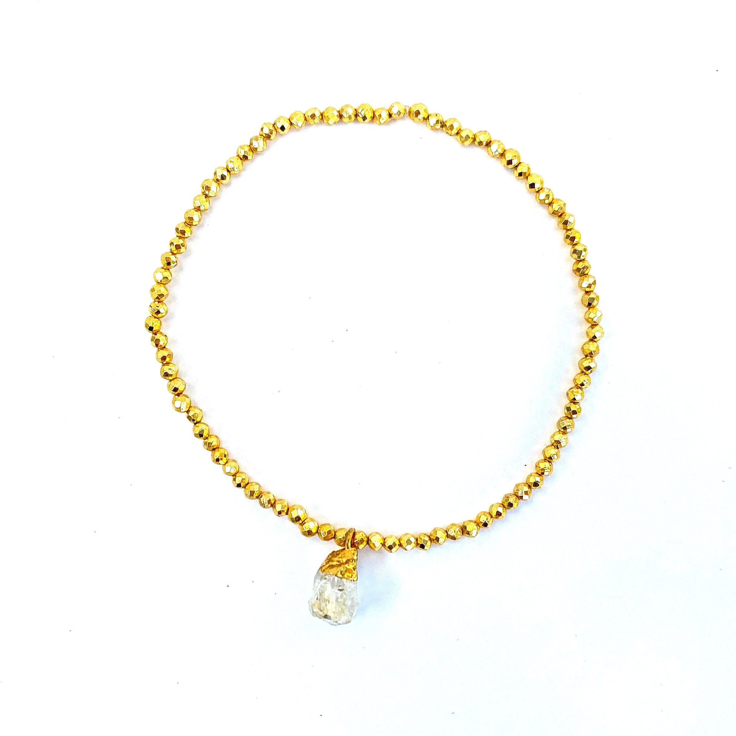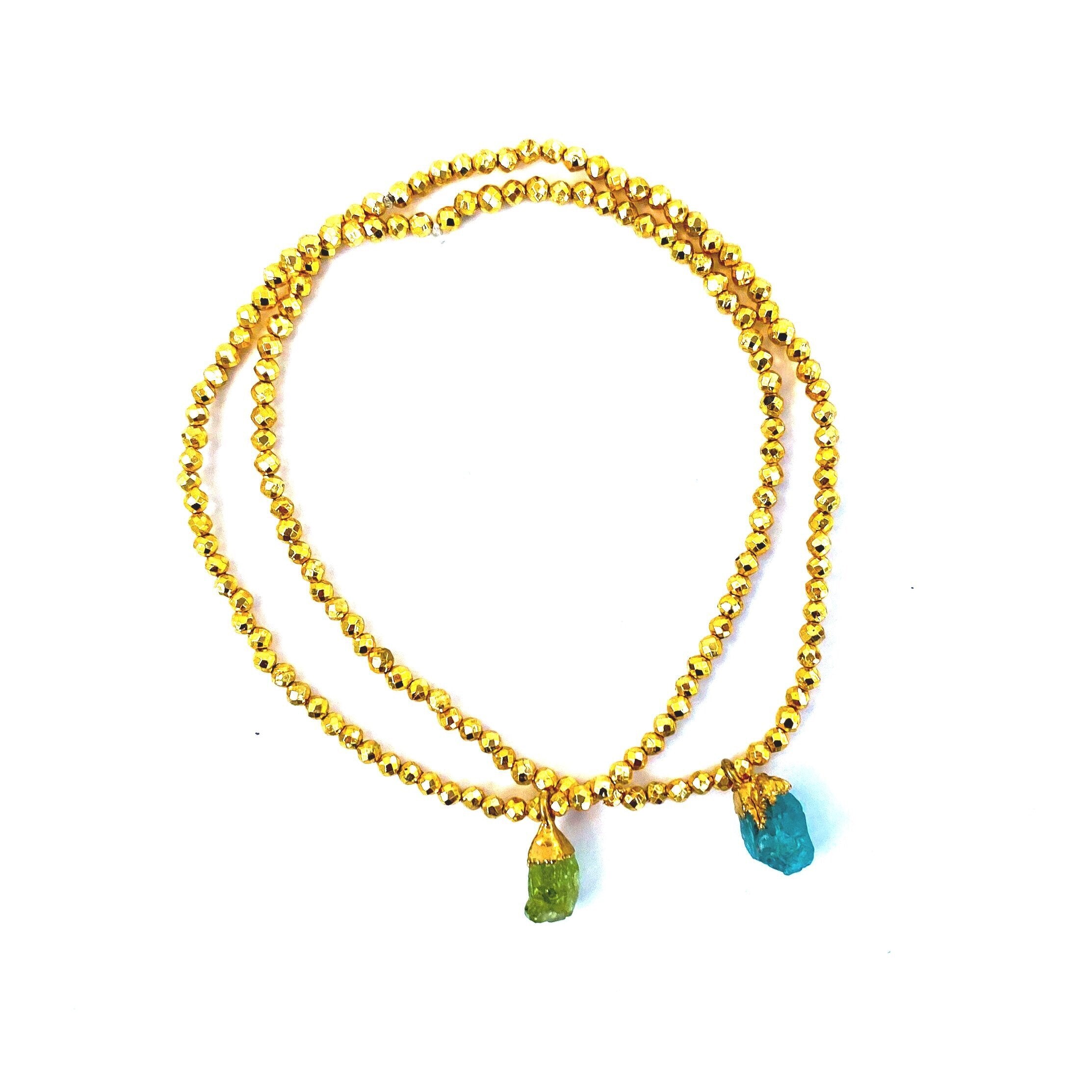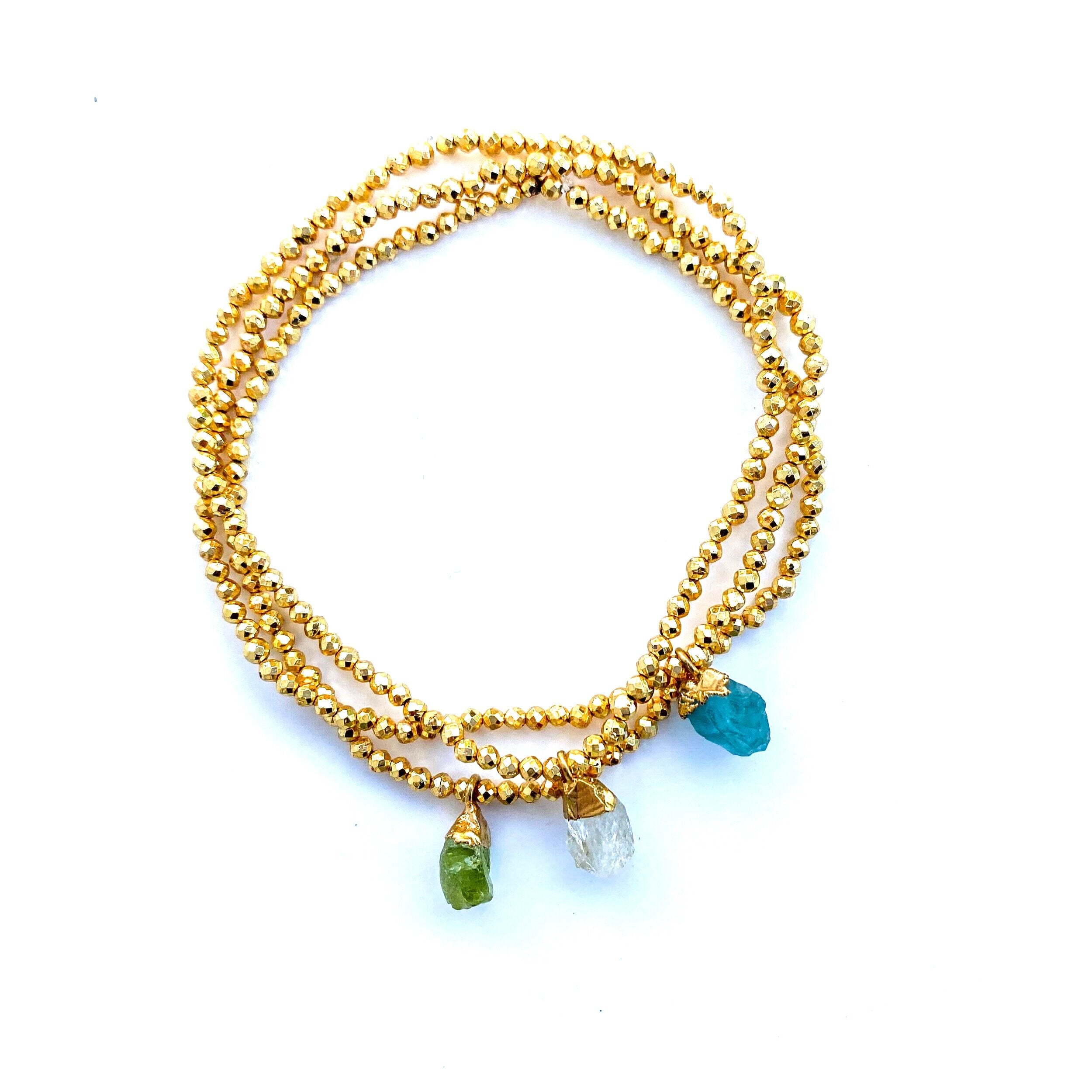 Soak up the serene beauty of island life with these sunny golden bracelets adorned with jewels of deep sea and white sand. Each brings powerful healing along with a centering + harmonious vibe. Choose between Peridot, Apatite and Moonstone … or layer them all for the full + free “take me away” feeling.