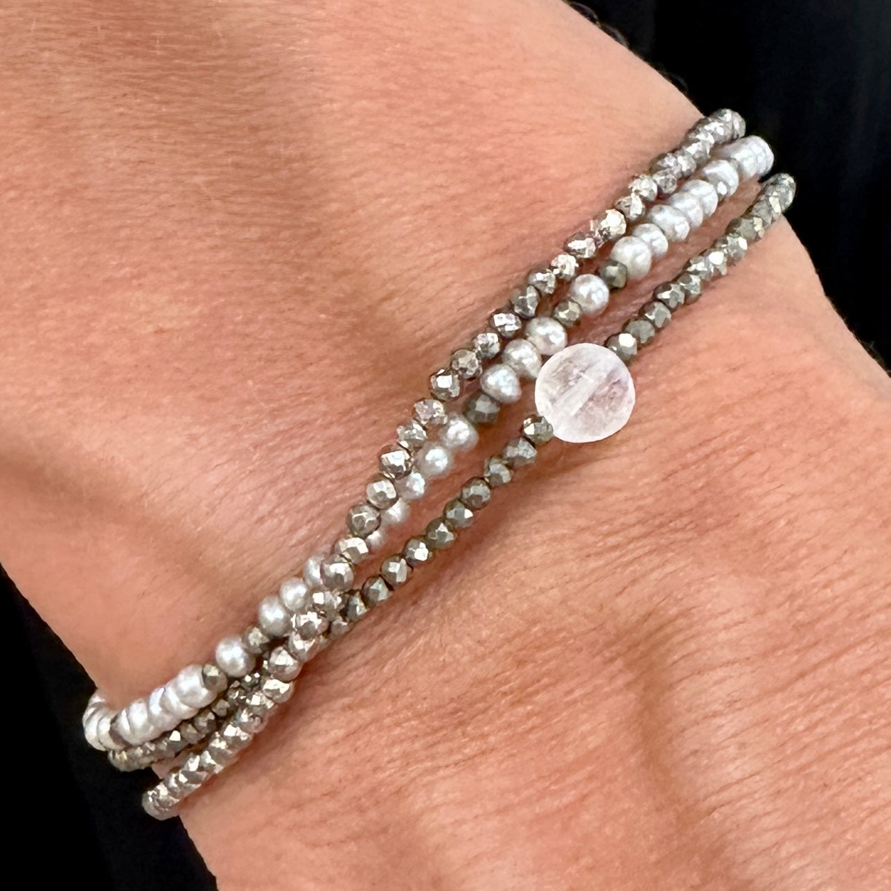 Add a bit of light + sparkle to your life and wrist with the versatile and easy to wear Moonstone + Pyrite stretch bracelet. Sweet on its own and an excellent piece to stacked with others.