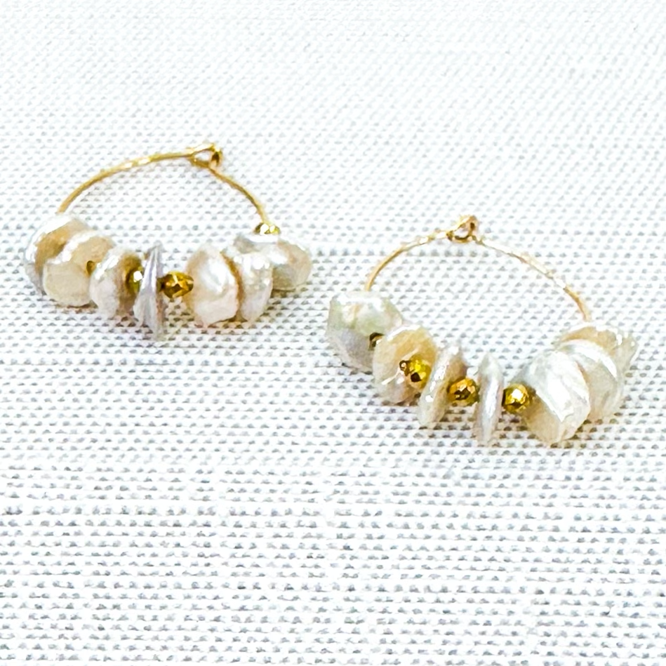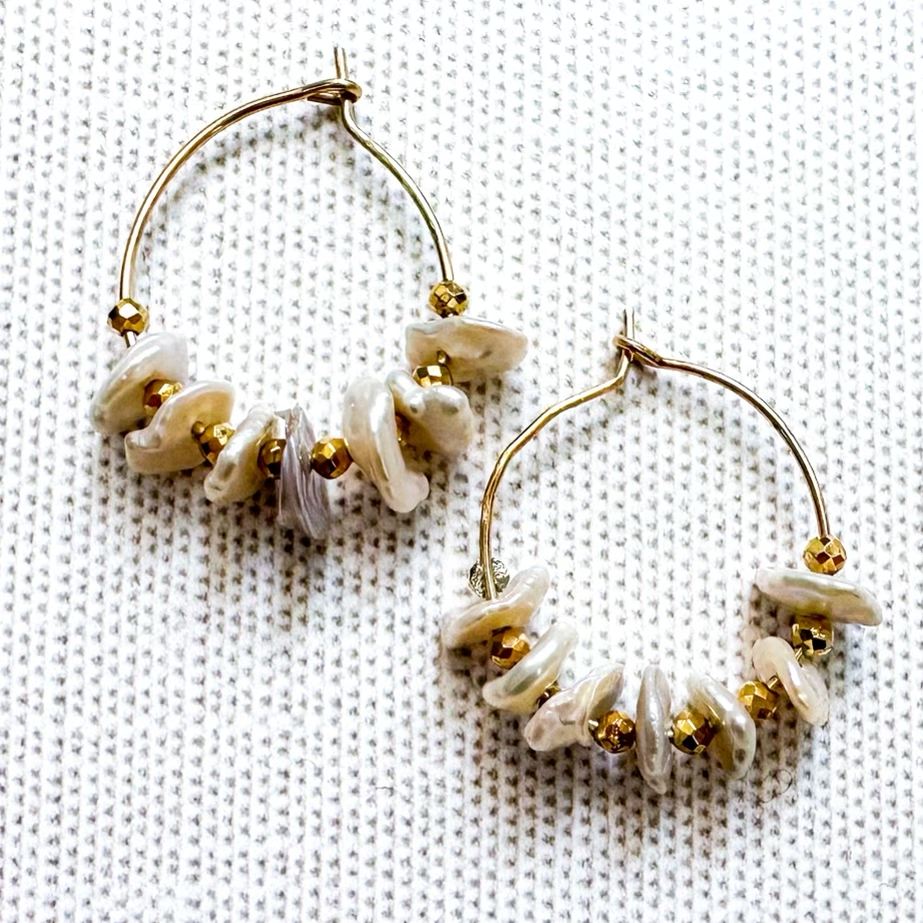 Delicately Gorgeous luminous Keshi Pearls + Pyrite adorn the perfectly simple summer hoop to create a stunning fresh + modern Pearl Earring. Sure to lift any outfit and satisfy any style, this earring will give you that By the Seaside vibe all year round.