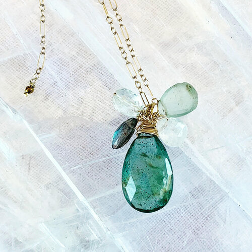This mixture of color and gem evokes the variety of hues of the sea. Aquamarine, the stone of courage and tranquility, paired with Moonstone, the stone of mystery, new beginnings and the Goddess, with just a touch of Labradorite, the stone of magic makes for a full healing experience and piece of jewelry that holds many treasures of Pisces Beauty. 18” adjustable chain.