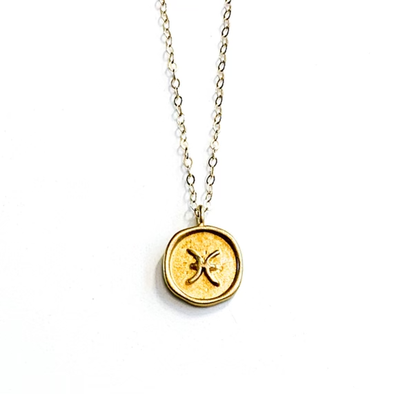 A gorgeous Gold Coin Zodiac Pisces Symbol shines brightly its own or paired with a Birthstone or other favorite jewelry. Each sign, unique in nature and design is sure to delight the Pisces in your world and Mothers and Fathers with her children's Birth Sign/s. Treat yourself to your sign and feel connected to the stars!