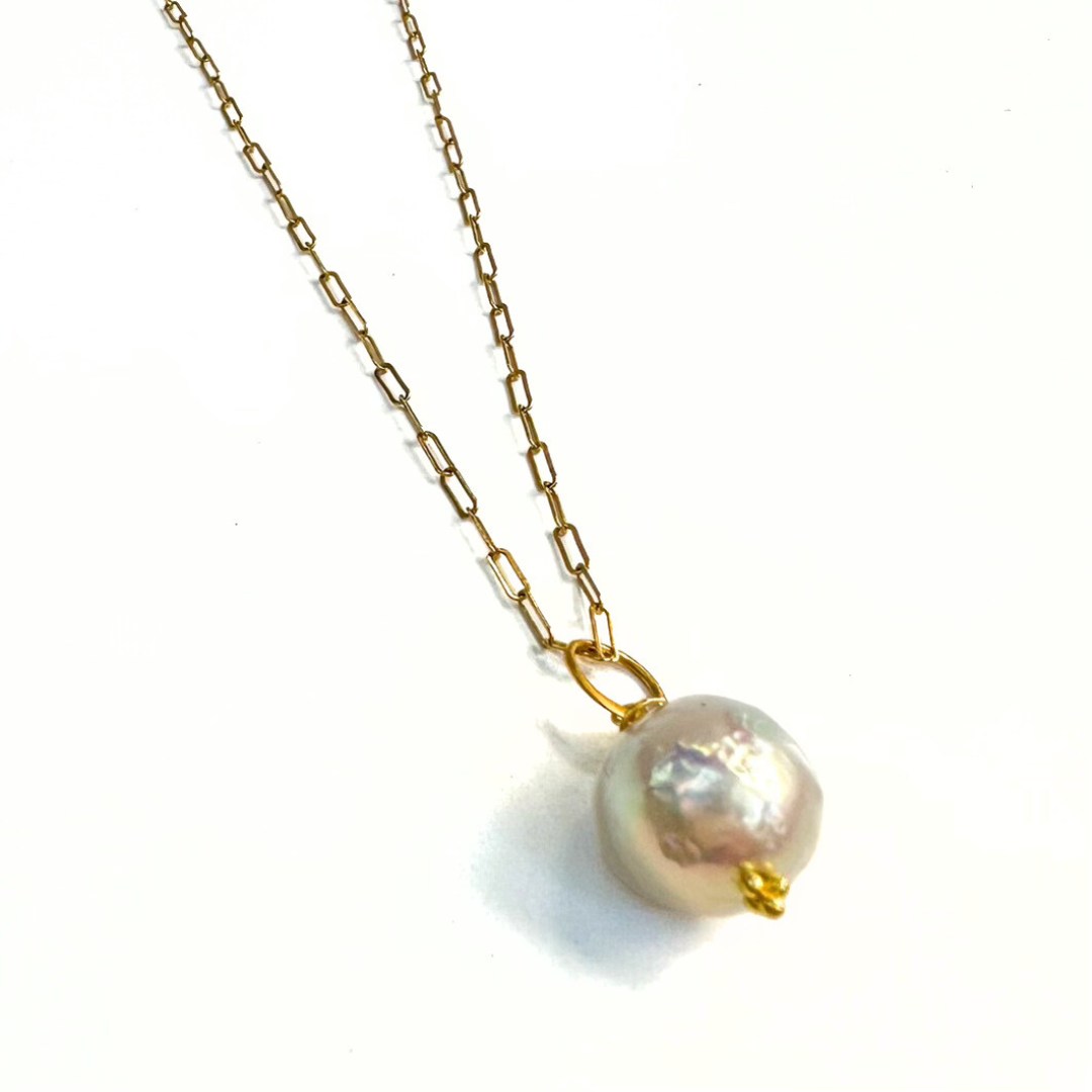 A luminescent Freshwater Baroque Pearl adorns a delicate Paperclip Chain in Gold or silver, making for an easy breezy, adjustable necklace to be worn at any length up to 18". This necklace is stand out on its own or mixes in beautifully with other jewelry.