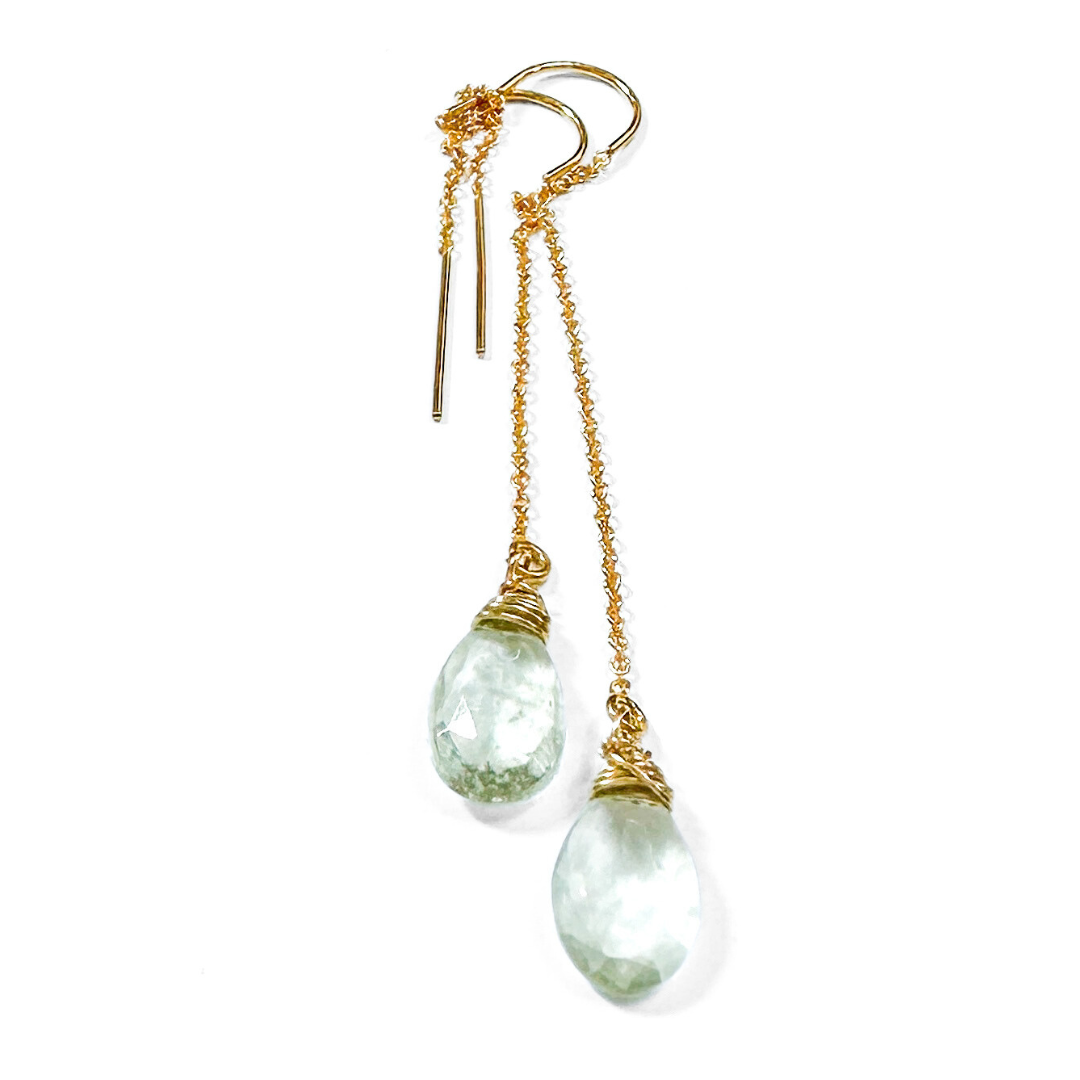 Delicate Drops of Luminescent Aquamarine adorn a chain of gold or silver to make an effortless + organic accompaniment to any clothing or bathing suit styles. The perfect accessory day or night on the beach or on the town, these earrings are sure to bring tranquility + fun.