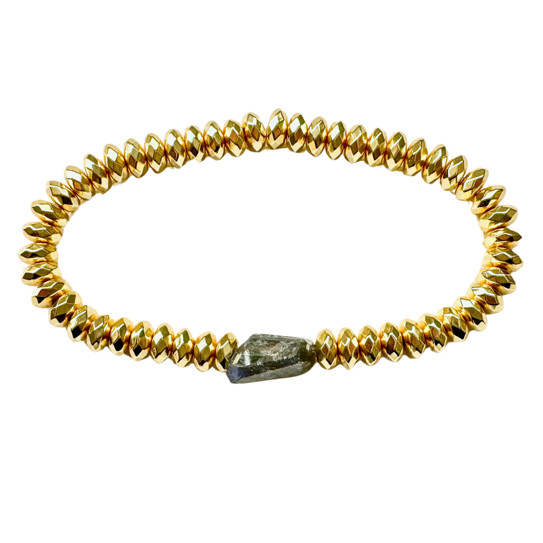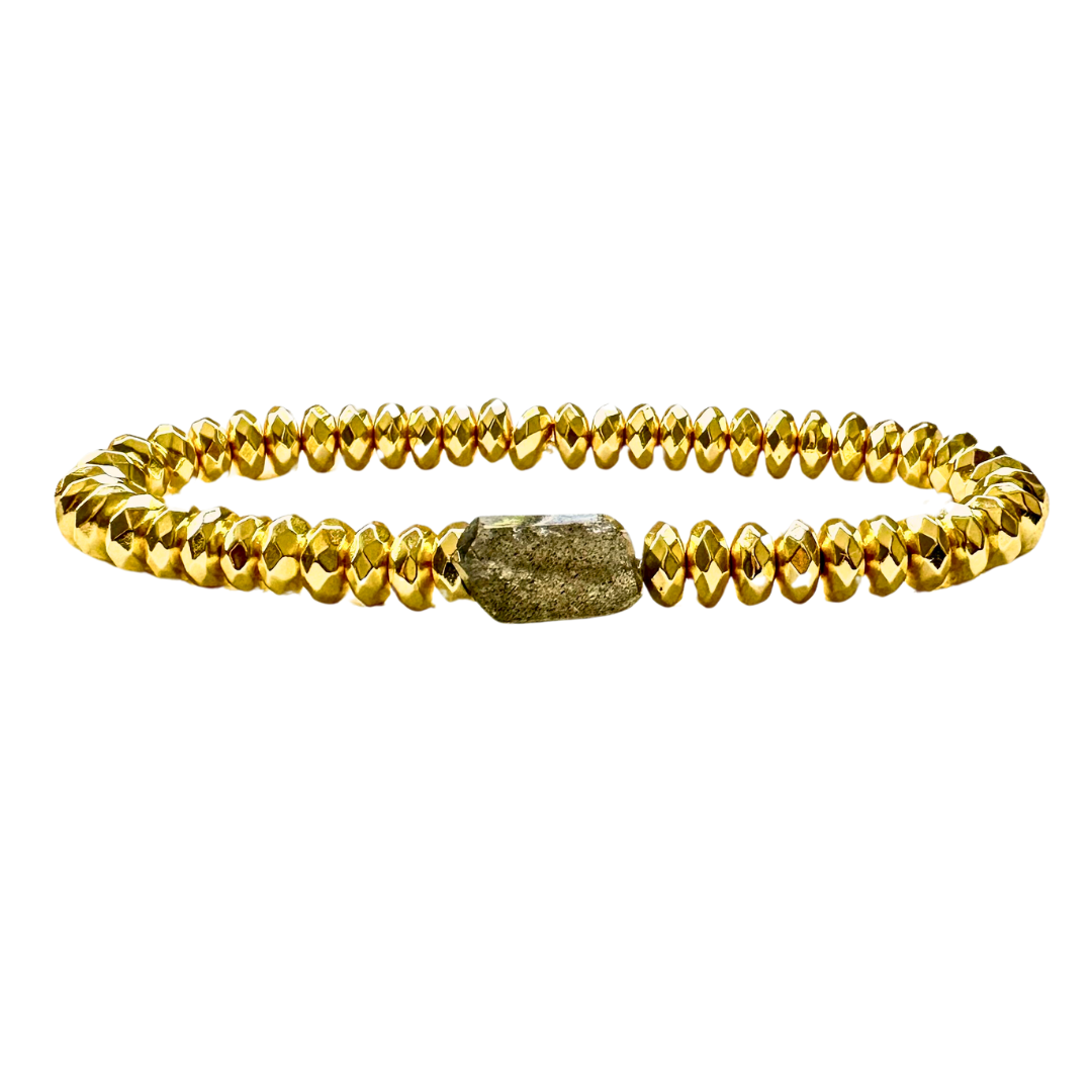 This beauty of bracelet, inspired by Theia, the Greek goddess of light and vision makes for a powerhouse of healing and adornment. Gold dipped Hematite, a grounding stone of manifestation surround a nugget of luminescent Labradorite, the bringer of light, stands on its own and is a lovely layering piece.