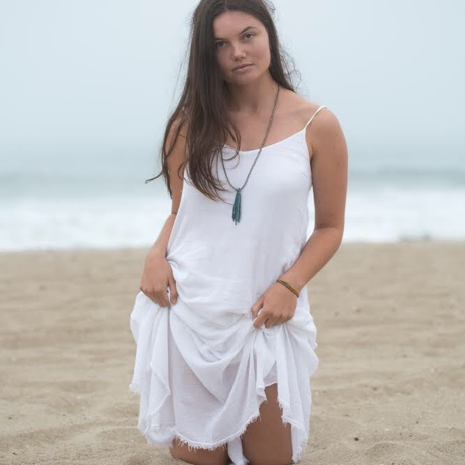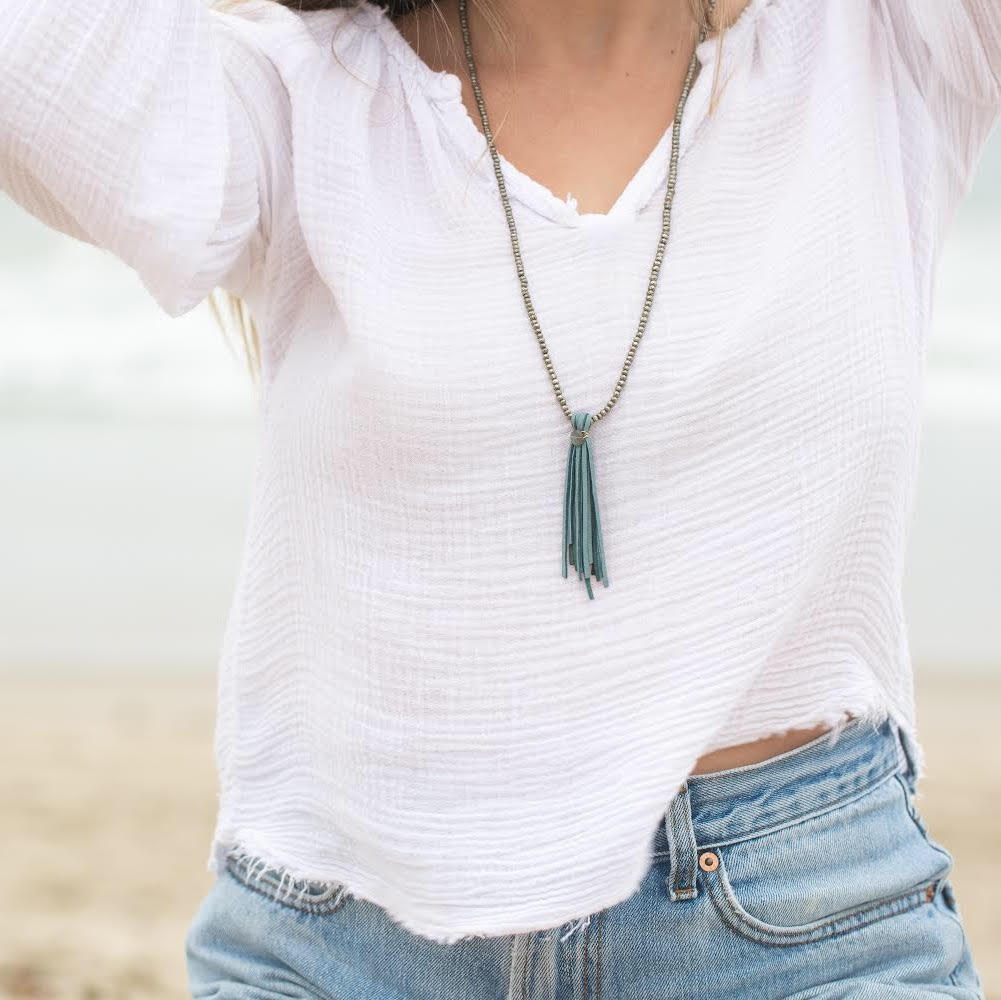 Sparkling Pyrite or luminescent Labradorite necklace adorned with a handmade suede tassel with a light-filled labradorite nugget for a delicate and fun bit of boho elegance. A versatile and great piece for jeans and a tee, beachwear or dressed up. 30" strand.